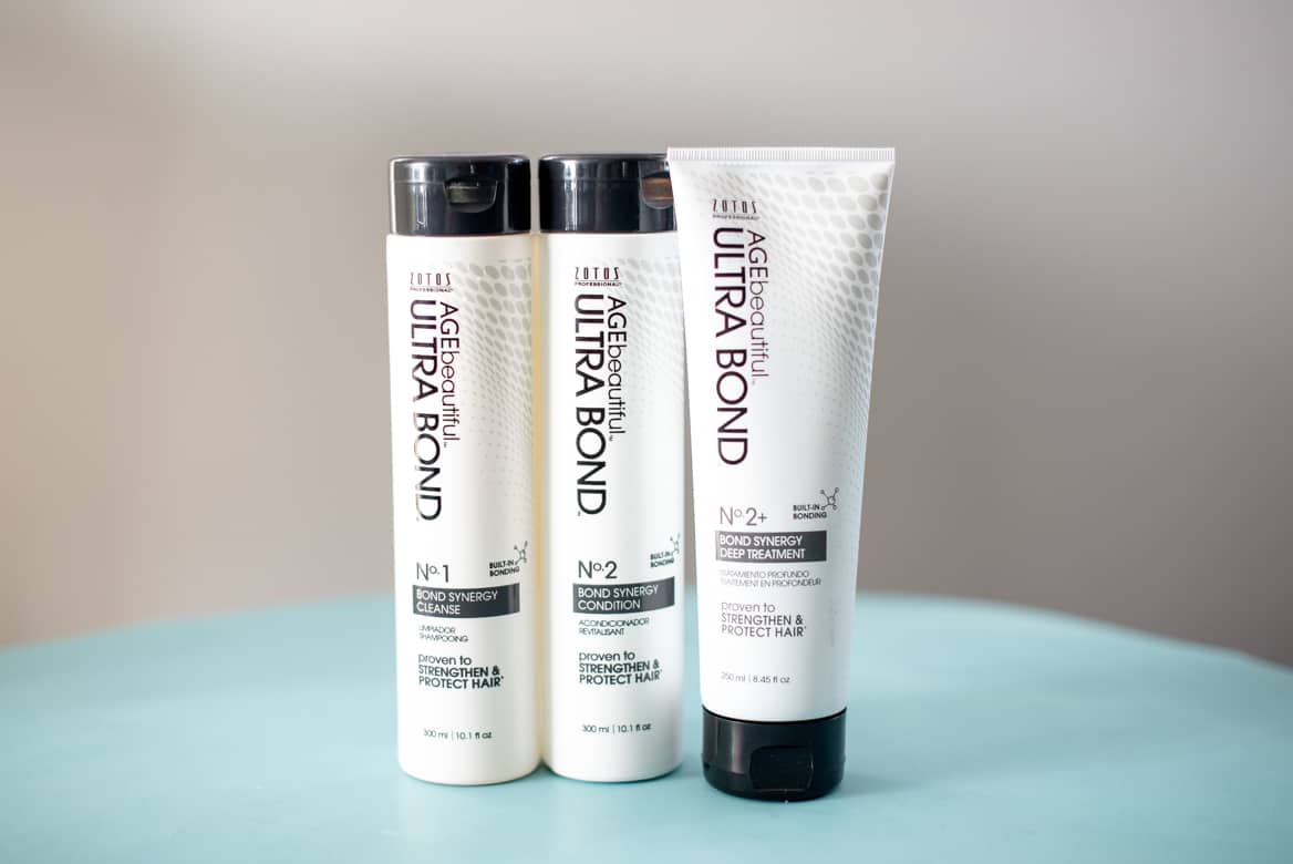I like to use AGEbeautiful® Ultra Bond Synergy No. 1 Cleanse Shampoo and Ultra Bond Synergy No. 2 Conditioner because the shampoo is free of sulfates and great for color treated hair, and the conditioner contains bond-building arginine, silk amino acids and keratin.
