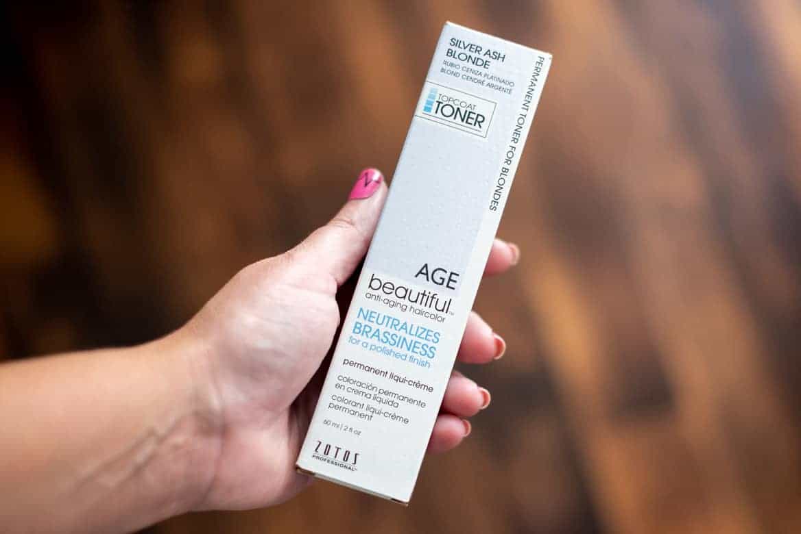 I was going for as platinum blonde as possible and because my natural hair was already pretty dark with a lot of orangey undertones, I went with the Silver Ash Blonde AGEbeautiful® Topcoat Toner.